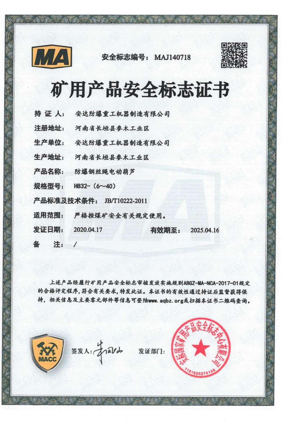 防爆鋼絲繩電動葫蘆 礦用產品安全標志證書