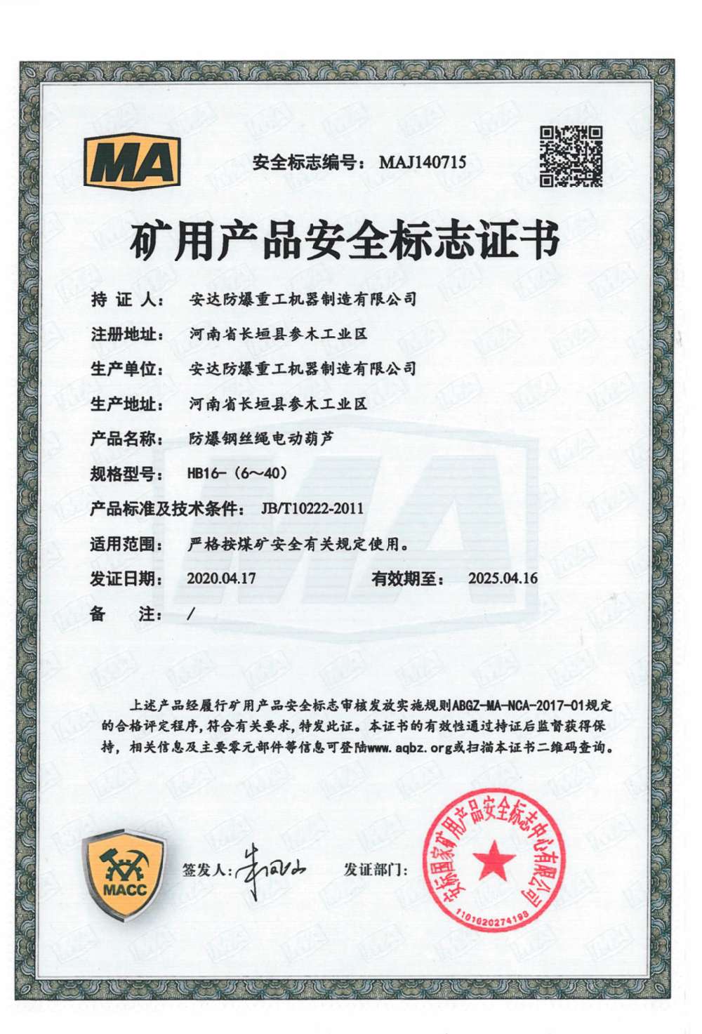 防爆鋼絲繩電動葫蘆 礦用產品安全標志證書