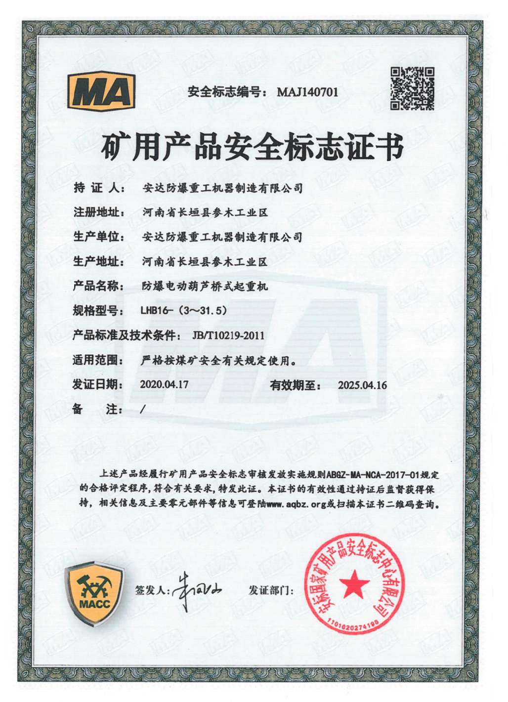 防爆鋼絲繩葫蘆橋式起重機 礦用產品安全標志證書