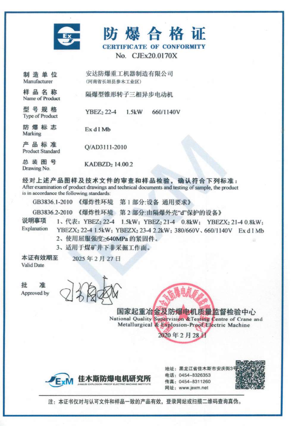 | 發(fā)證機(jī)構(gòu): | 國(guó)家起重冶金及防爆電機(jī)質(zhì)量監(jiān)督檢測(cè)中心 | 發(fā)證時(shí)間 : | 2020-02-28 |