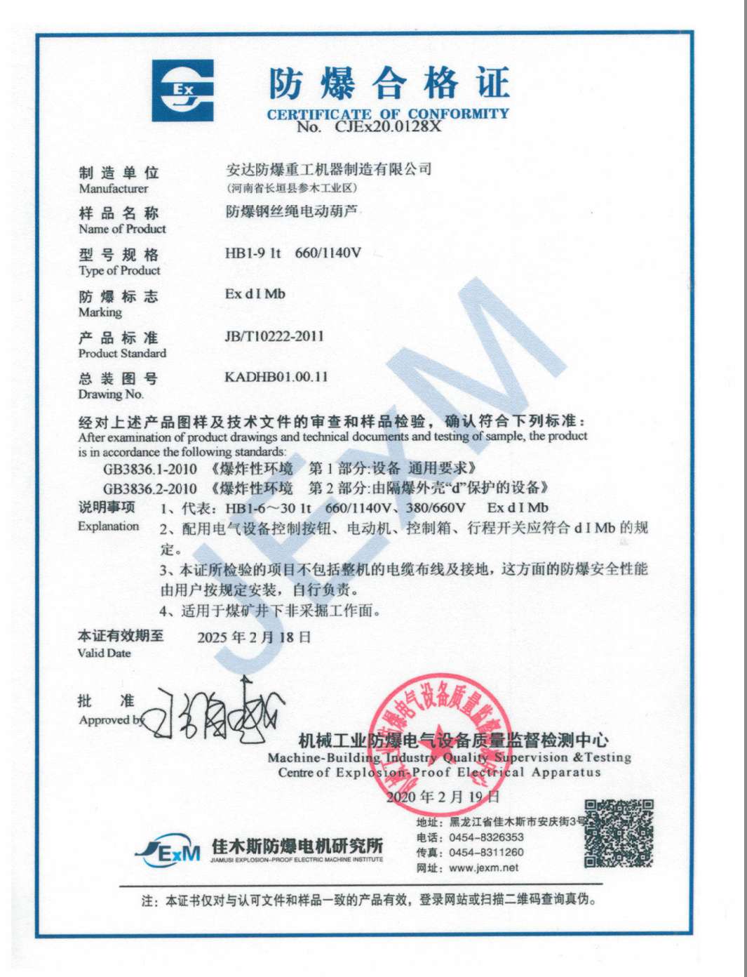 | 發(fā)證機(jī)構(gòu): | 機(jī)械工業(yè)防爆電氣設(shè)備質(zhì)量監(jiān)督檢測中心 | 發(fā)證時(shí)間 : | 2020-02-19 |