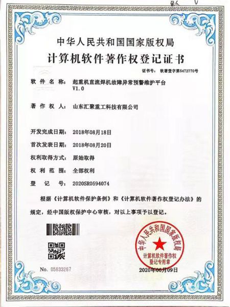 榮譽(yù)資質(zhì) 起重機(jī)直流焊機(jī)故障異常預(yù)警維護(hù)平臺(tái) V1.0