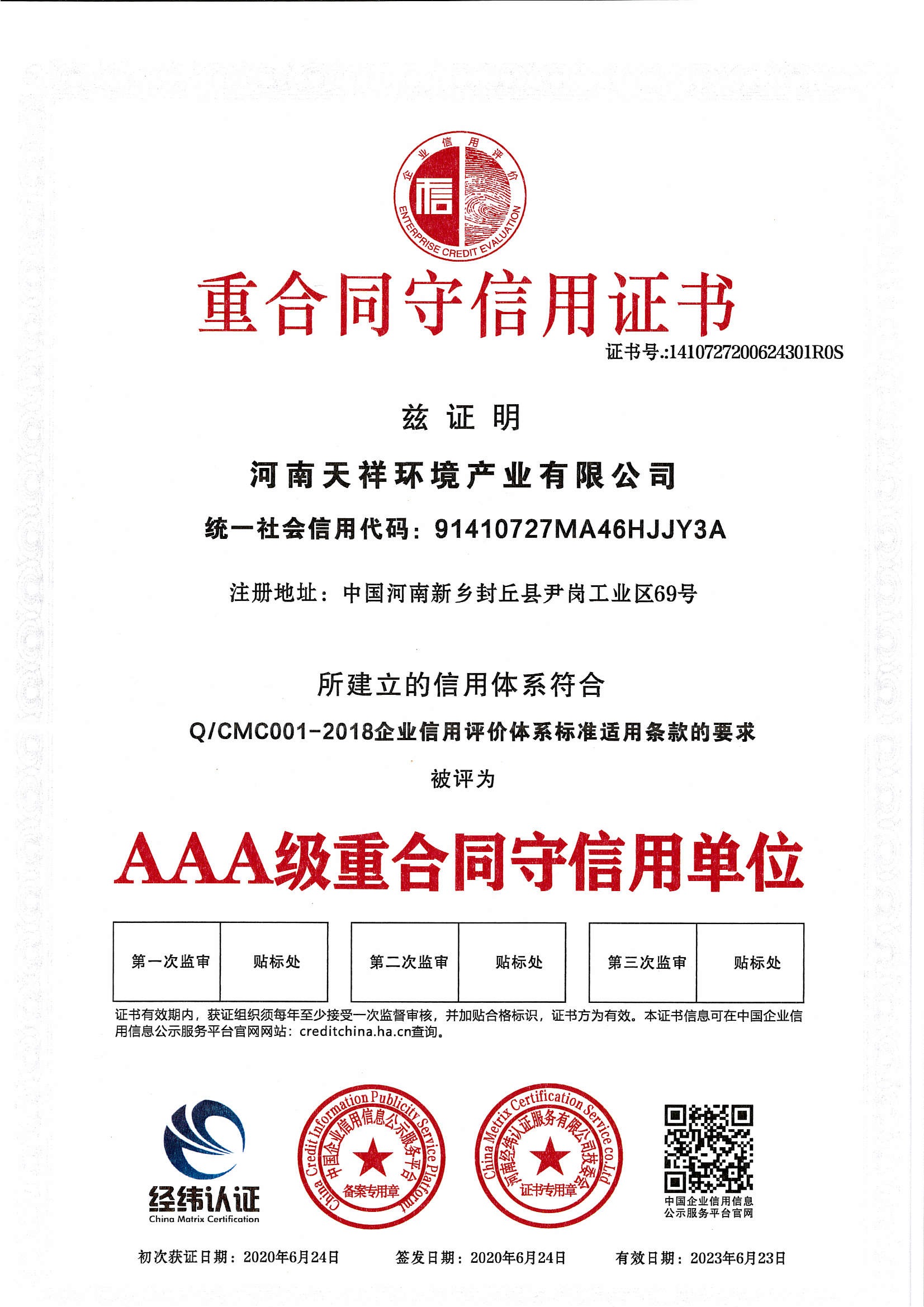 重合同守信用證書