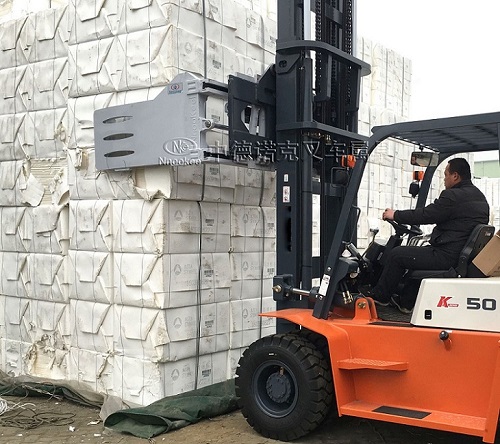 然而叉車盡管能夠改善運(yùn)輸速度,但基于棉花包“重”、“大”的特征,在棉花包的整體流轉(zhuǎn)方面——特別是搬運(yùn)、裝卸方面上,始終難以很好地提升整體效率。在這樣的作業(yè)現(xiàn)狀中,一款專用于輔助叉車完成高質(zhì)量、高效率搬運(yùn)的屬具,出現(xiàn)在人們的視野當(dāng)中:中德諾克棉花軟包夾。