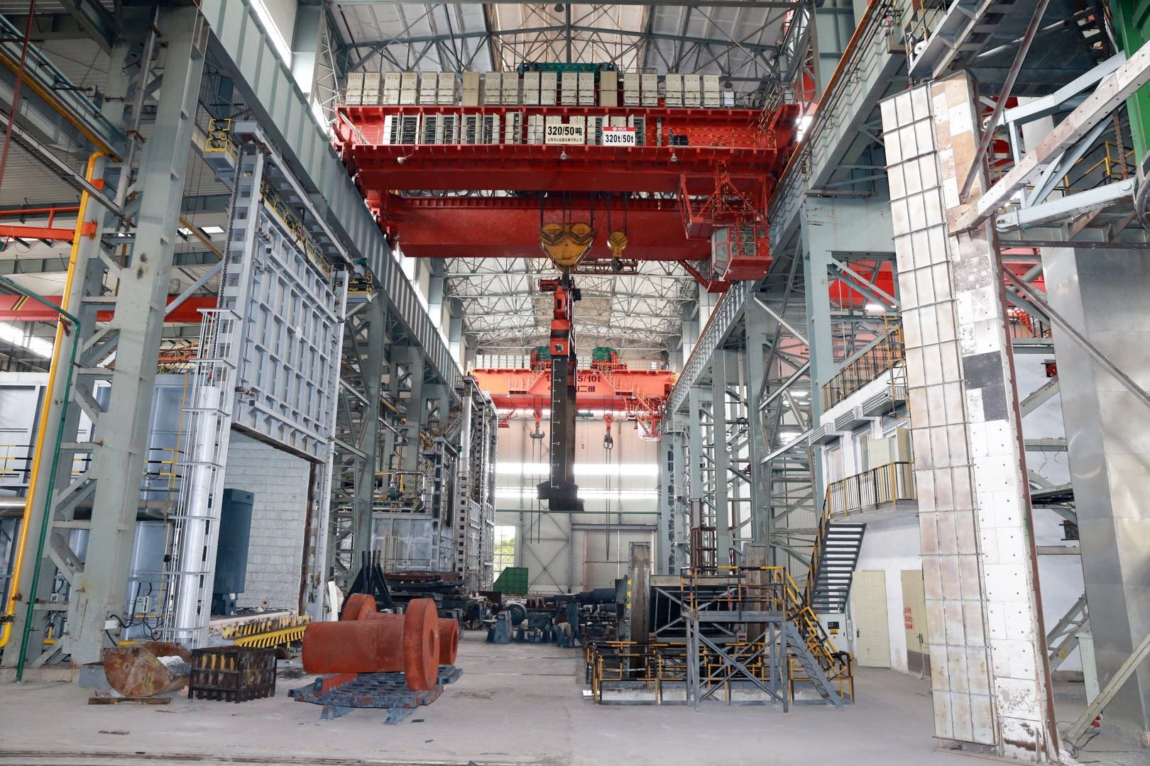 淬火起重機用于淬火工序時,將工件快速浸入淬火液中的起重機火起重機是用在金屬熱處理立式井淬工藝的專用起重機械,用來對大型工件或細長桿件快速浸入淬火液中淬火。淬火起重機主要用于冷卻介質為鹽水、水、礦物油的淬火工藝。根據淬火工藝要求,熾熱工件需要迅速地浸入到淬火池中,以保證工件上下金相組織均勻,并可避免油淬時的油面燃燒起火。其**顯著的特點是起升機構具有快速下降的環節,要求快速下降、準確定位制動。淬火起重機的結構主要由箱形橋架、起重小車、大車運行機構、司機室和電氣控制系統組成。箱形橋架具有制造工藝簡單、組裝方便、通用性強、利于自動焊接及抗扭剛度好等優點。包括兩件主梁、兩件端梁、走臺及欄桿等。主梁是承受載荷的主要構件,采用正軌箱型結構上面鋪設有軌道,供起重小車沿主梁方向作橫向移動,主梁的下翼板處設置有隔熱層,既可隔熱又可起到防濺的作用。主梁與箱型端梁焊接而成一體,端梁中間布置有接頭,由螺栓連接,供橋架拆分運輸。走臺用來放置大車運行機構、電氣設備,并兼作檢修平臺和通道用,外側設有防護欄桿。