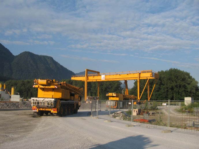 它的金屬結構像門形框架,承載主梁下安裝兩條支腳,可以直接在地面的軌道上行走,主梁兩端可以具有外伸懸臂梁。