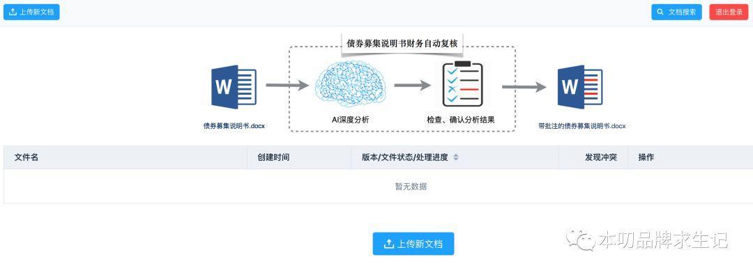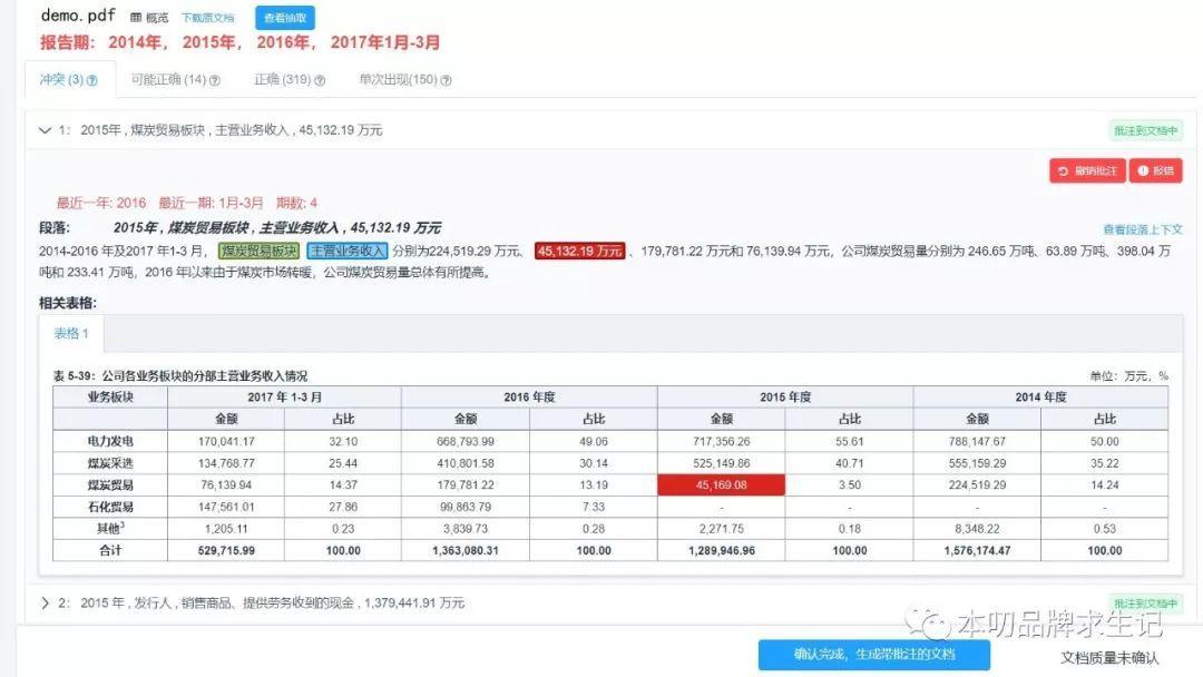 用戶(hù)只需上傳一個(gè)Word格式的 “債券募集說(shuō)明書(shū)”,過(guò)大約半個(gè)小時(shí),這一功能就能自動(dòng)找到募集說(shuō)明書(shū)里財(cái)務(wù)數(shù)據(jù)可能的錯(cuò)誤和沖突,一條一條的列出來(lái)供用戶(hù)復(fù)核。