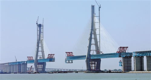 5月21日,由中鐵大橋局承建的滬通(上海—南通)長江大橋28號主塔墩,開始進行第14輪大節段鋼梁的吊裝作業。此次吊裝的輔助跨鋼梁是滬通長江大橋主橋架設中體型最大、重量最重的一個雙節段,重量接近1800噸。吊裝完成后隨即進行高栓施擰和焊接作業,預計本月底可實現主橋首個鋼梁合龍口的勝利“會師”。