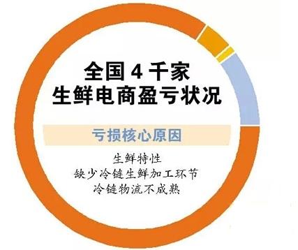 據中國電子商務研究中心發布的一組數據顯示:生鮮電商 4000 多家入局者中,4%持平,88%虧損,且剩下的7%是巨額虧損,最終只有1%實現了盈利。而據另一組公開數據顯示,2018年我國生鮮市場交易規模達到4萬億元,其中生鮮電商行業市場交易規模達到2103.2億元,較2017年(1402.8億元)增長49.93%。也就是說,交易規模大、被稱為最后一片電商藍海的生鮮電商,卻長期飽受1%的低盈利概率之痛。