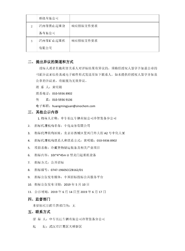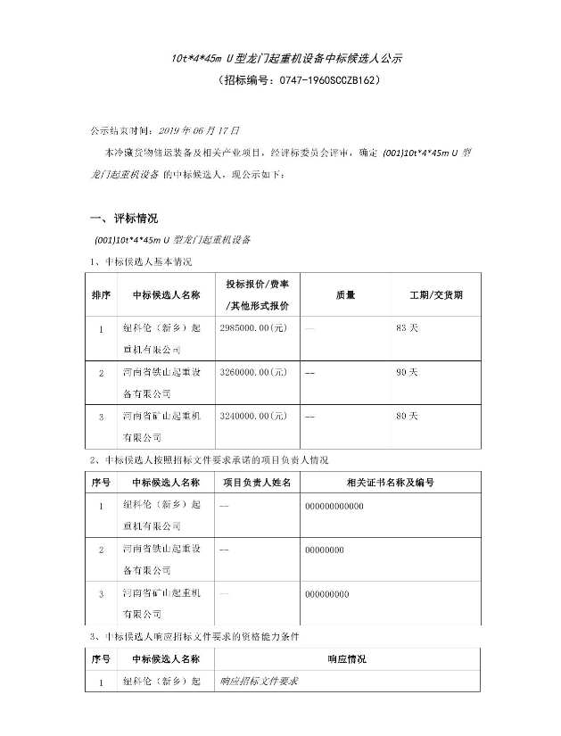 10t*4*45m U型龍門起重機設備中標候選人公示