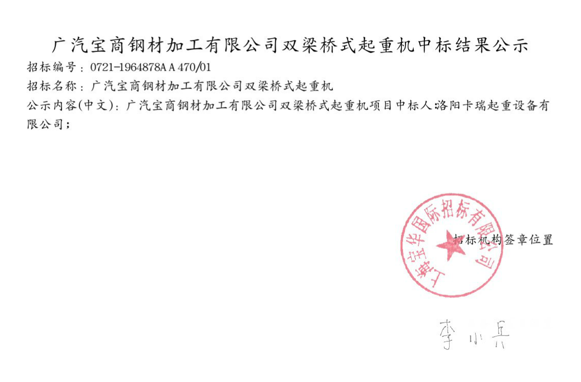 移動(dòng)版:廣汽寶商鋼材加工有限公司雙梁橋式起重機(jī)中標(biāo)結(jié)果公示