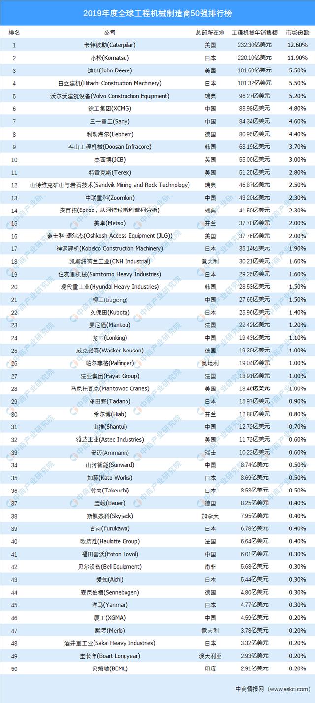 世界領(lǐng)先的工程信息提供商——英國(guó)KHL集團(tuán)發(fā)布了最新全球工程機(jī)械制造商50強(qiáng)排行榜(YellowTable2019),榜單顯示,全球范圍內(nèi)上榜企業(yè)2018年總收入為1840億美元,比2017年增加了13.5%。2019全球工程機(jī)械50強(qiáng)排名前十的分別是卡特彼勒、小松、迪爾、日立建機(jī)、沃爾沃設(shè)備、徐工集團(tuán)、三一重工、利勃海爾、斗山工程機(jī)械和杰西博,前十大企業(yè)占據(jù)全球市場(chǎng)份額超過(guò)60%。
