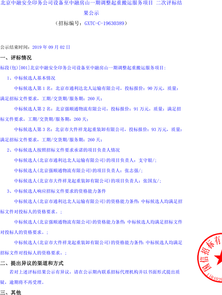 北京中融安全印務(wù)公司設(shè)備至中融房山一期調(diào)整起重搬運(yùn)服務(wù)項(xiàng)目 二次評(píng)標(biāo)結(jié)果公示