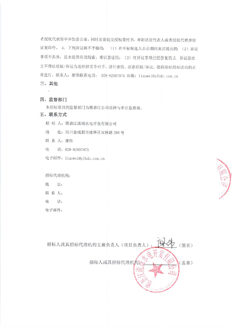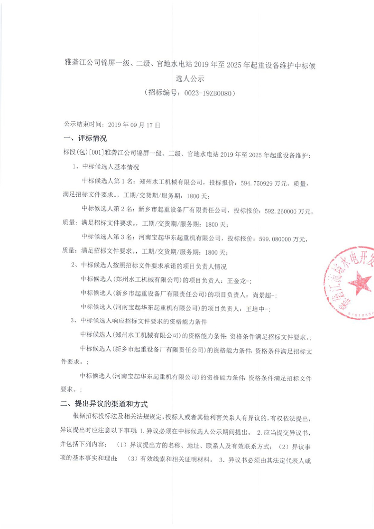 雅礱江公司錦屏一級、二級、官地水電站2019年至2025年起重設備維護中標候選人公示