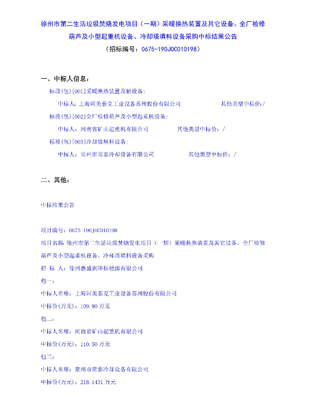 徐州市第二生活垃圾焚燒發(fā)電項(xiàng)目(一期)采暖換熱裝置及其它設(shè)備、全廠檢修葫蘆及小型起重機(jī)設(shè)備、冷卻塔填料設(shè)備采購中標(biāo)結(jié)果公告