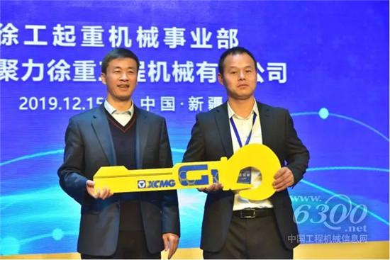 徐工起重機事業部總經理助理、營銷公司總經理王萬才將QAY650A金鑰匙交付至新疆萬新吊裝公司