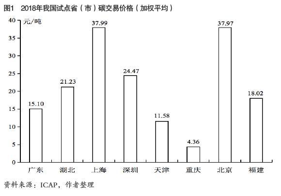 2011年10月,國家發(fā)展改革委確定在北京、天津、上海、重慶、廣東(廣州)、湖北、深圳開展碳排放權(quán)交易試點,2013年6月,深圳率先啟動碳交易;2016 年9月,福建省為貫徹落實《國家生態(tài)文明試驗區(qū)(福建)實施方案》,加入碳交易試點。目前,8 個試點地區(qū)覆蓋了電力、鋼鐵、水泥、建筑、交通運輸、石油化工等行業(yè)超過3200家重點排放企業(yè),整體履約良好,低碳意識不斷提高,實現(xiàn)了碳排放總量和強度“ 雙下降” 。2 0 1 8 年我國試點省市碳排放權(quán)交易平均價格為21.3元/噸;截至2018年底,我國碳市場累計成交量接近8億噸,累計成交額超過110億元(我國試點省市碳交易價格見圖1,試點碳市場運行情況見表1)。