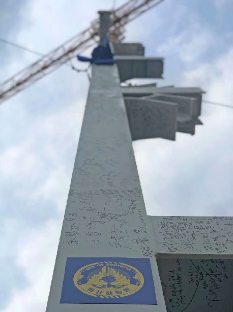 圖為上海迪士尼度假區、上海國際旅游度假區管委會、上海申迪(集團)有限公司、華特迪士尼幻想工程員工在首根鋼結構柱上簽名留念。新華網 發