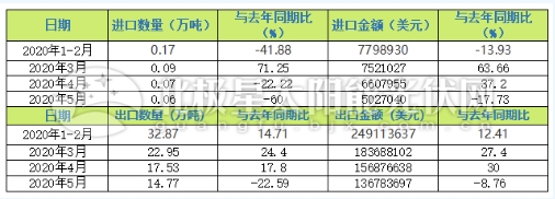 據海關數據顯示,2020年5月份我國光伏玻璃出口數量為14.77萬噸,同比22.59%,出口金額為1.36億美元,同比減少8.76%。5月,光伏玻璃進口數量為0.06萬噸,同比下滑60%,進口金額為502.7萬美元,同比減少17.73%,光伏玻璃進出口數據雙方向持續低迷。