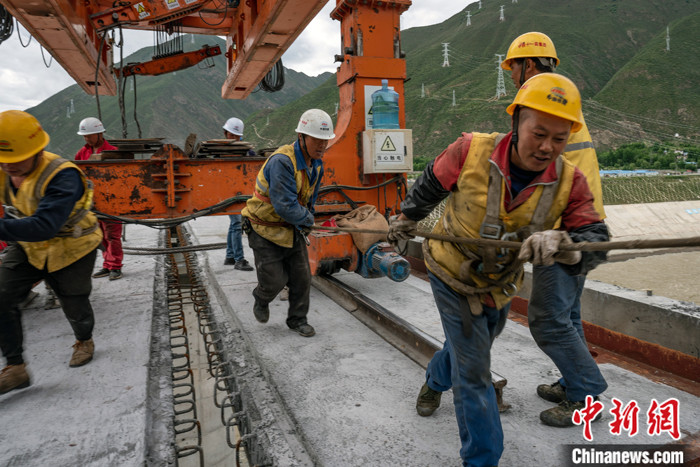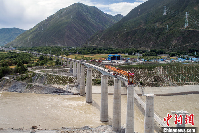 圖為當日,架橋機在雅魯藏布江上方進行架設作業。中新社發 崔金鳳 攝