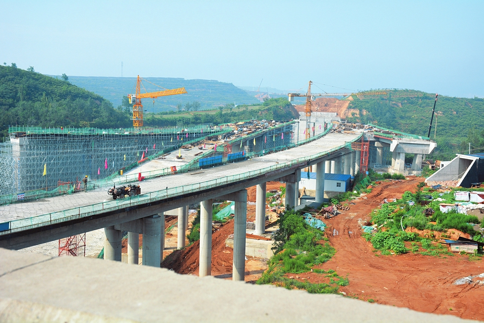 7月15日,處于垣澠高速公路與聞垣高速公路交接部位的車家溝大橋在緊張施工。垣澠高速南起河南澠池,北至山西垣曲,全長約63公里。其中,山西段長約21公里,預算總投資50億元,工期3年,項目建成后將對促進晉豫兩省經濟發展產生深遠影響。(來源:山西日報 文哲 攝)