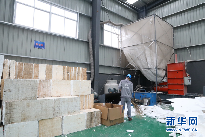 上海市閔行區浦錦街道兩網融合中轉站采用泡沫冷壓方式對泡沫塑料進行壓縮進行處理,冷壓后的泡沫塑料在重量不變的情況下體積大大縮減。新華網史依靈 攝