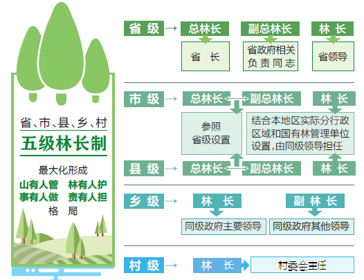 《意見》要求分級設立林長。省級設立總林長、副總林長和林長,其中總林長由省長擔任、副總林長由省政府相關負責同志擔任、林長由省領導擔任。市、縣兩級分別設立總林長、副總林長和林長,其中總林長、副總林長參照省級設置,林長結合本地區實際分行政區域和國有林管理單位設置,由同級領導擔任。鄉級設置林長、副林長,林長由同級政府主要領導擔任,副林長由同級政府其他領導擔任。村級設置林長,由村委會主任擔任。