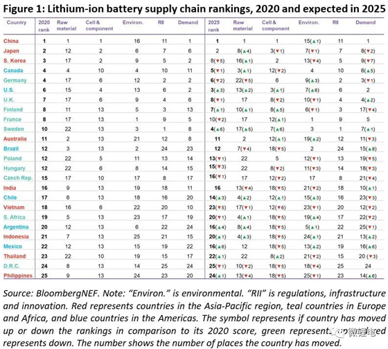 BNEF還考察了原材料獲取、電池和零部件制造能力、監管、創新和基礎設施以及國內需求來確定總體排名,排名如下所示。