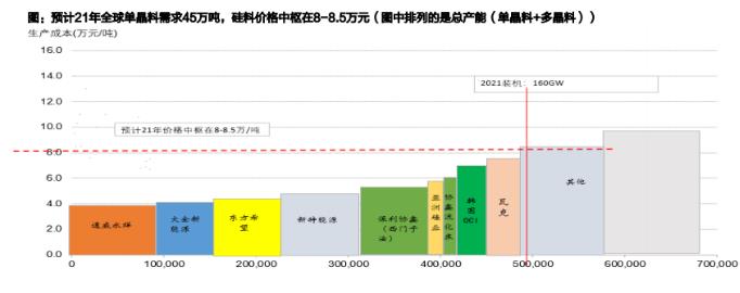 考慮單W硅耗約2.8w,則21年160GW裝機需求對應約45萬噸單晶料需求,根據行業成本曲線,國內五大廠,OCI,瓦克貢獻43.4萬噸產量, 因此21年硅料價格中樞落在較瓦克成本附近,瓦克生產成本約7.5萬元/噸,考慮增值稅,我們預計21年硅料價格中樞在8-8.5萬元。