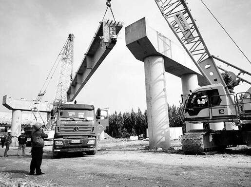昨日,記者在中華大街北延跨北繞城高速公路施工現(xiàn)場(chǎng),看到一片熱火朝天的施工場(chǎng)面,吊車正懸掛起一根預(yù)制T型梁進(jìn)行橋梁架設(shè),已經(jīng)吊裝到位的T型梁正在進(jìn)行橫隔板混凝土澆筑。在北側(cè)不遠(yuǎn)處,伴著“隆隆”的轟鳴聲,壓路機(jī)、瀝青攤鋪機(jī)等機(jī)械一起開工,路基作業(yè)正在全面展開。