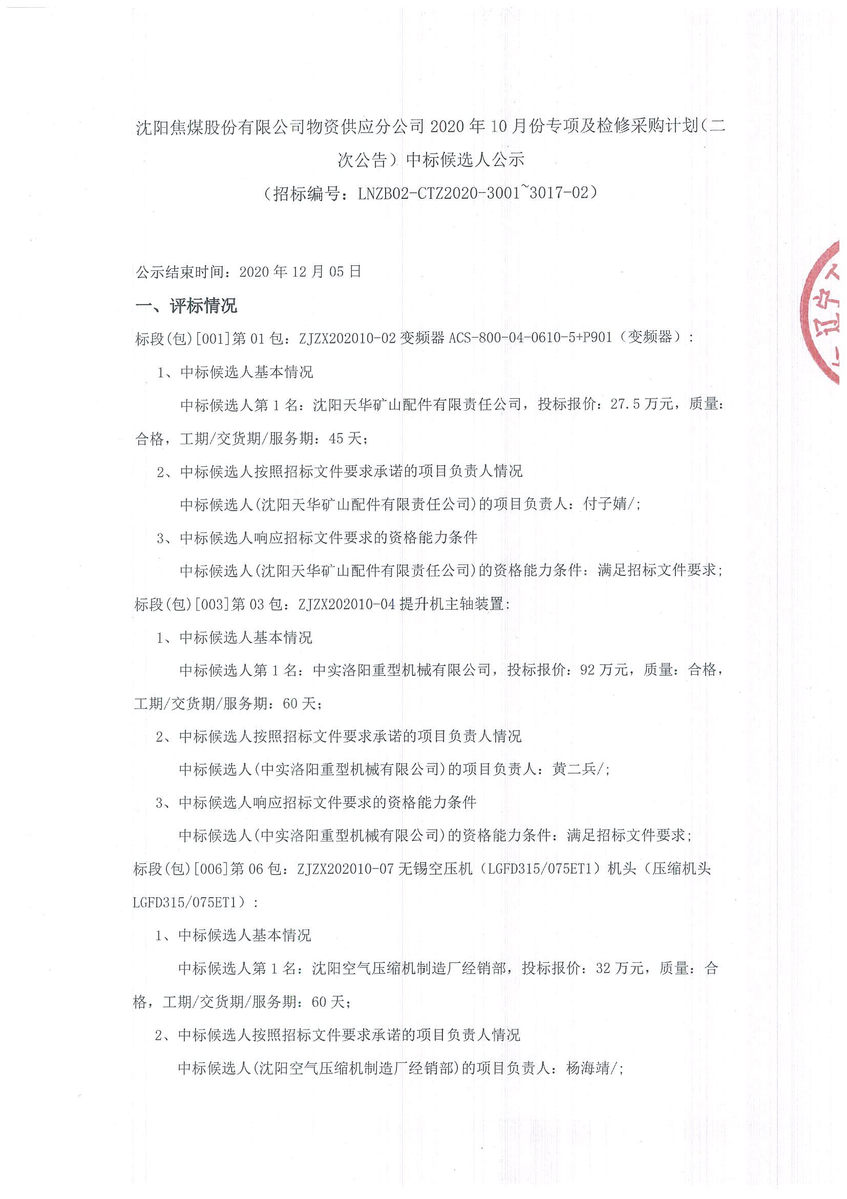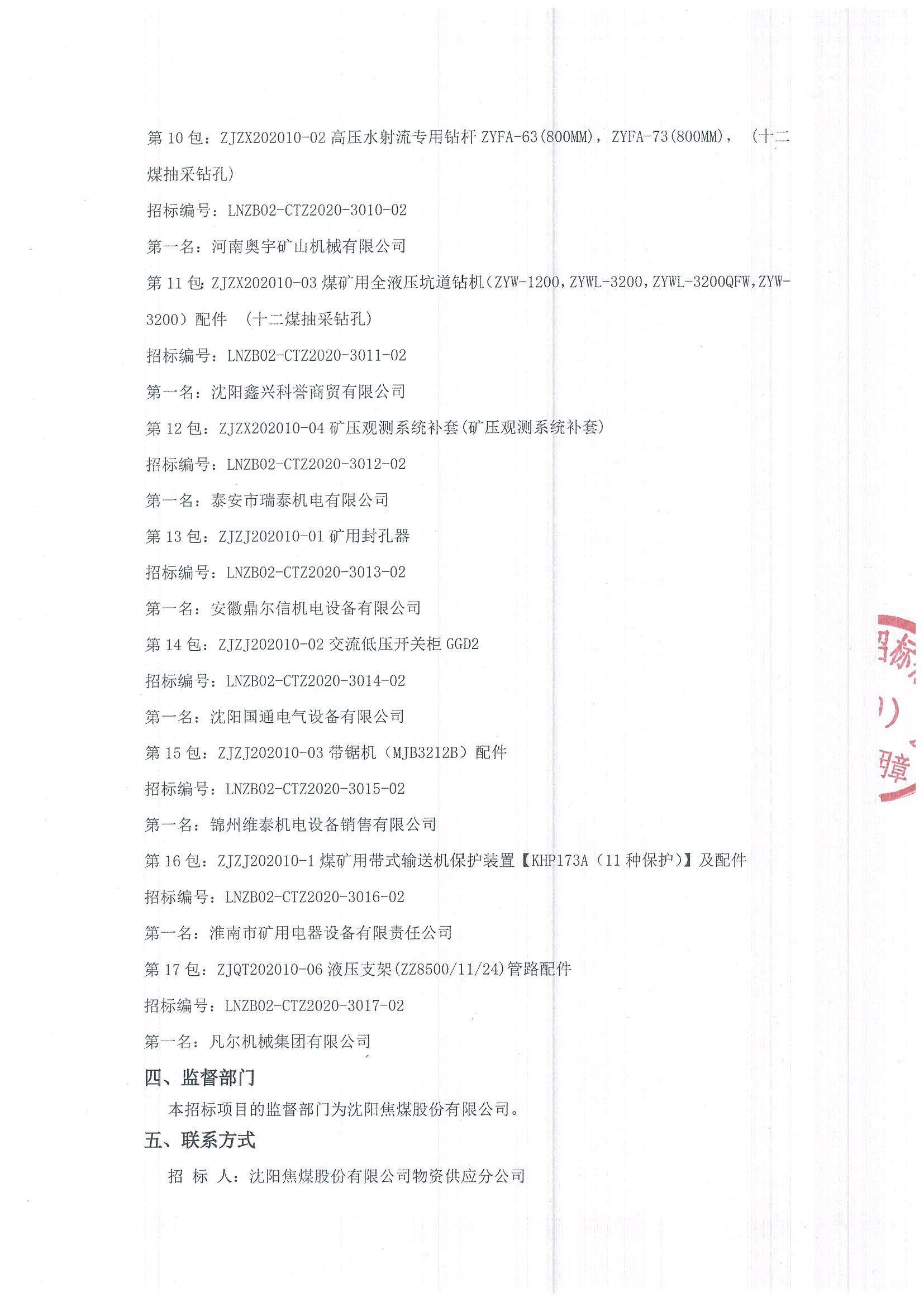 移動版:沈陽焦煤股份有限公司物資供應分公司2020年10月份專項及檢修采購計劃(二次公告)中標候選人公示