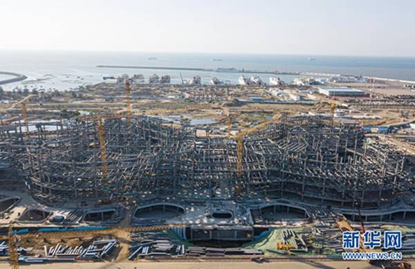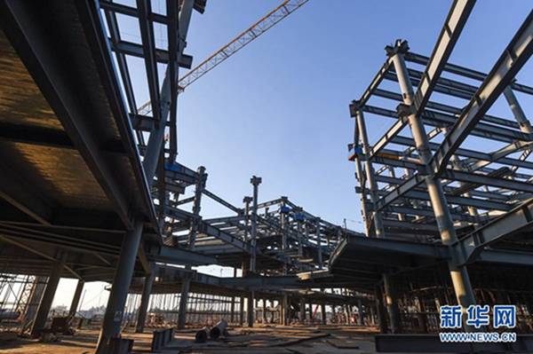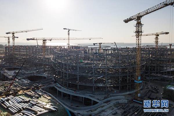 這是2021年1月1日拍攝的施工中的??趪H免稅城項目免稅商業中心。新華社記者 蒲曉旭 攝