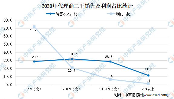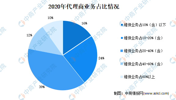 數據顯示,2020年,占到40%-60%(含)和超過60%的兩部分代理商的比重分別為12.20%和9.80%,各增加了0.4和0.2個百分點,增幅都要弱于前兩年;另外,仍有78.00%的代理商,其后市場業務所占比例不足40%,后市場業務所占比重在10%以下的代理商雖然仍占15.50%,但比2019年比重減少了0.8個百分點。