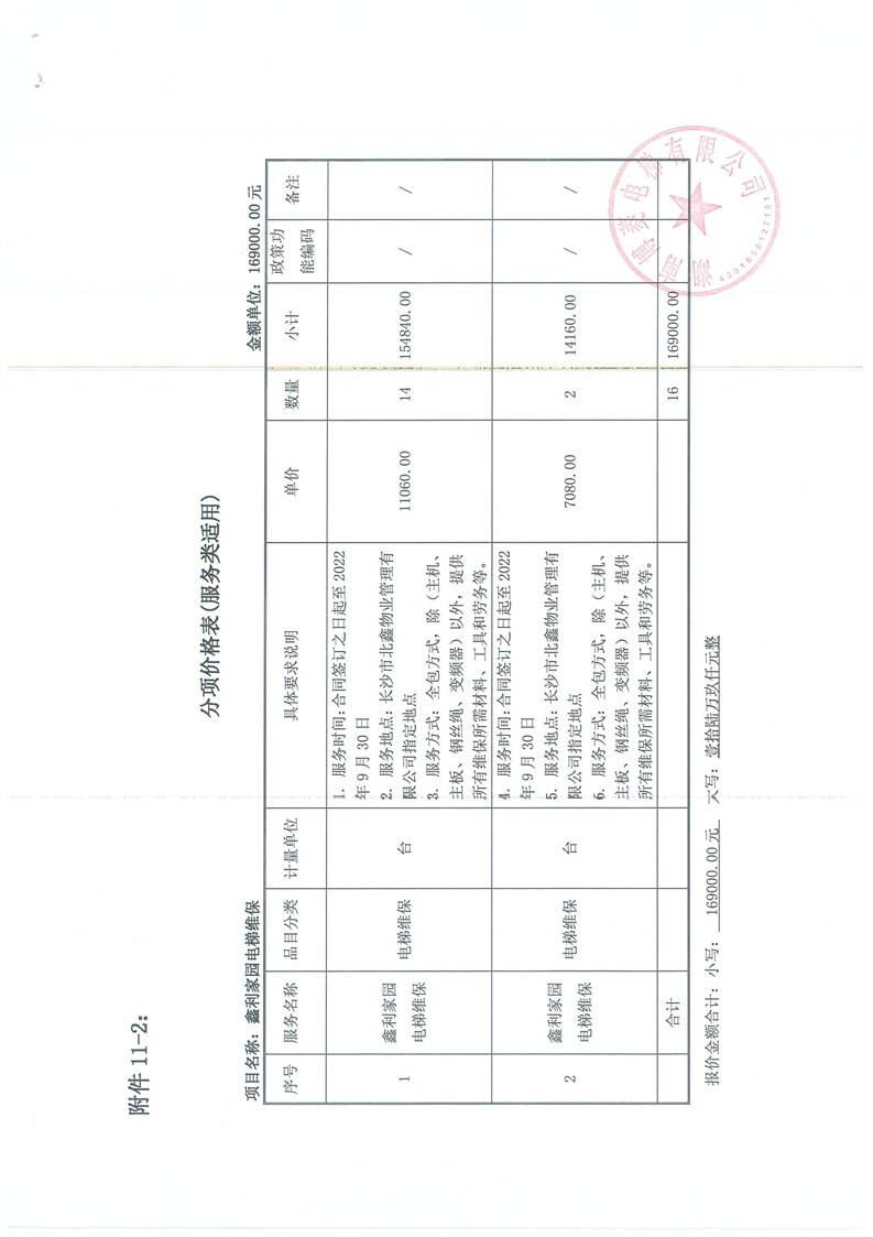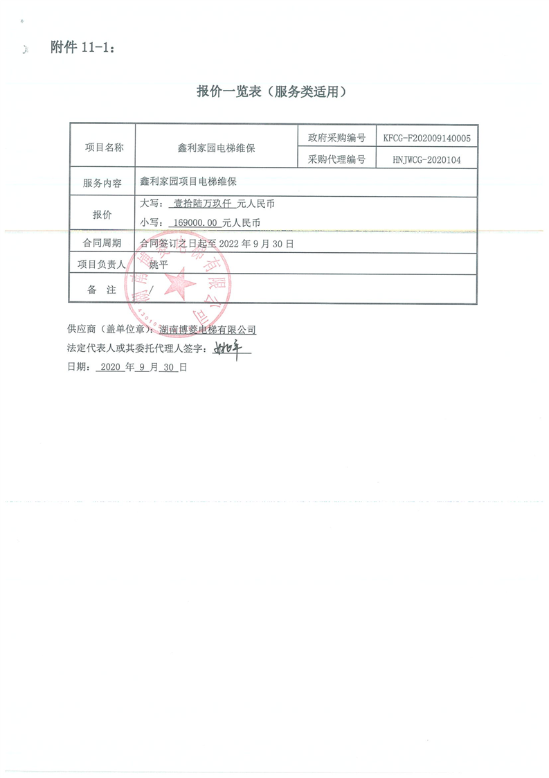 長沙市北鑫物業(yè)管理有限公司鑫利家園電梯維保合同公告合同公告
