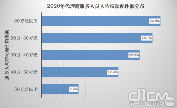 另外一個衡量代理商維修服務經營業績的核心指標是人均服務帶動配件銷售額,表現優異的代理商(服務人員人均帶動配件銷售額超過50萬元)占代理商群體的比重為8.4%;中等評價的代理商(服務人員人均帶動配件銷售額在30萬至50萬元之間)占代理商群體的比重為39.6%;表現平庸的代理商(服務人員人均帶動配件銷售額在20萬至30萬元之間、低于20萬元)占代理商群體的比重分別為25.1%和26.9%。
