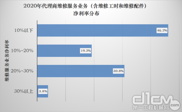 部分原因在于制造商的營銷政策,把維修服務工時費用更多地作為競爭贈送條件。所以整體而言,代理商群體的維修服務業務的凈利率較低,凈利率低于10%的代理商占到了代理商群體的46.2%,凈利率在10%~20%之間的占到了19.2%,20%~30%之間的占到了30.8%,凈利率超過30%的占到了代理商群體的3.8%。