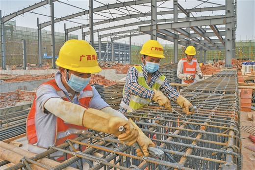 位于南寧市邕寧區新興產業園的天際項目總投資58億元,預計今年年底建成。圖為工人們在搶抓工期。