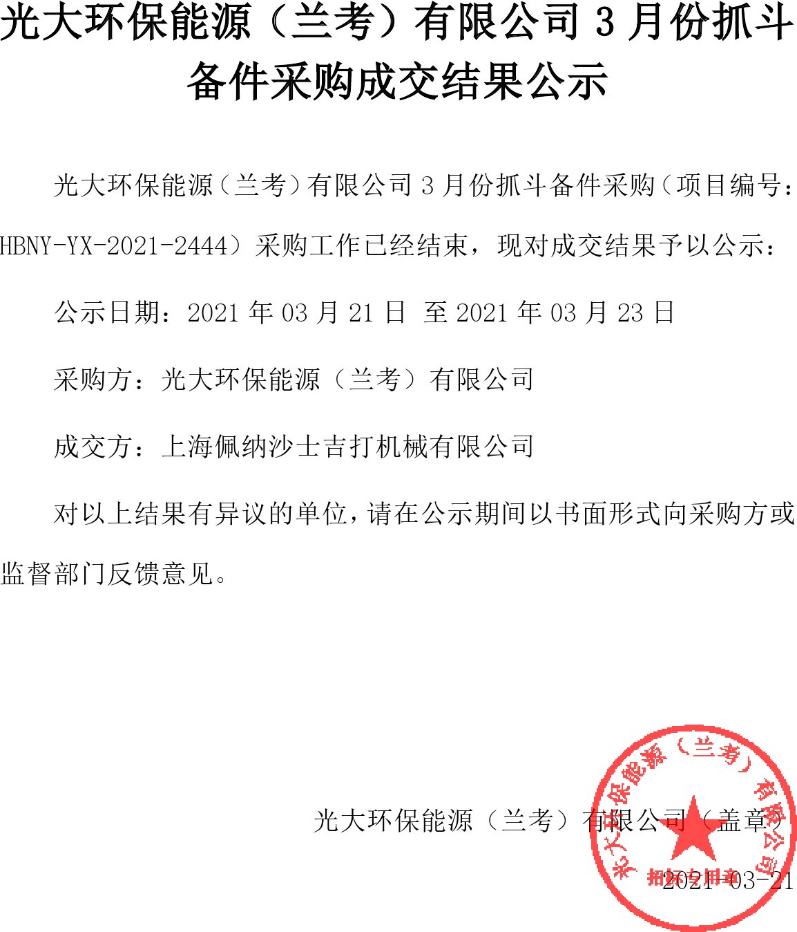 光大環保能源(蘭考)有限公司3月份抓斗備件采購成交結果公示 SWF文件鏈接