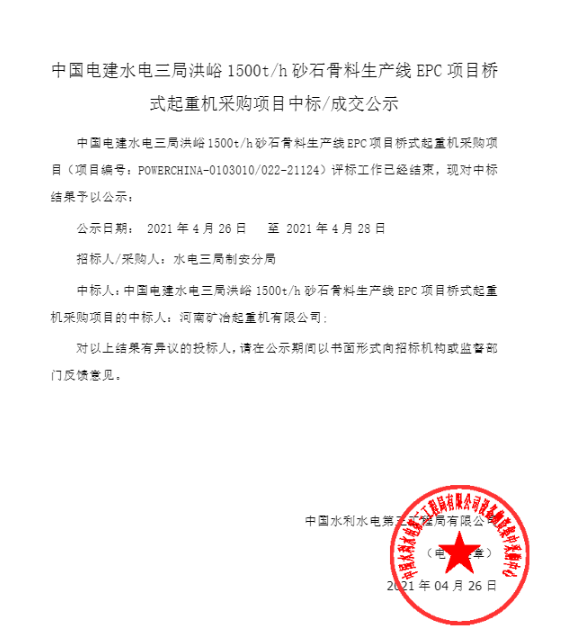 招標(biāo)公司受業(yè)主委托,于2021-04-26在網(wǎng)上發(fā)布:【設(shè)備類】中國電建水電三局洪峪1500t/h砂石骨料生產(chǎn)線EPC項(xiàng)目橋式起重機(jī)采購項(xiàng)目成交公示。各有關(guān)單位請與公告中招標(biāo)負(fù)責(zé)人接洽聯(lián)系,及時(shí)開展投標(biāo)及相關(guān)工作,以免錯失商業(yè)機(jī)會。
