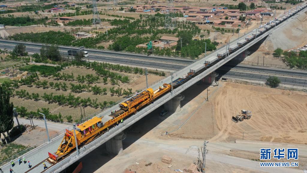 5月30日,中鐵十一局建設者操作CPG500型鋪軌機在中蘭客專甘肅段新墩特大橋上進行鋪軌作業(無人機照片)。 新華社記者 陳斌 攝
