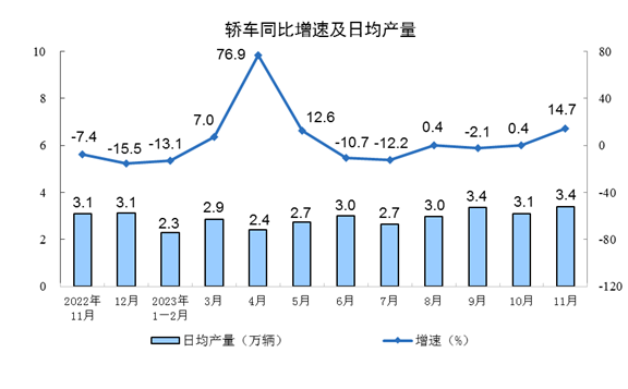 分行業看,11月份,41個大類行業中有28個行業增加值保持同比增長。其中,煤炭開采和洗選業增長5.2%,石油和天然氣開采業增長1.8%,農副食品加工業下降0.5%,酒、飲料和精制茶制造業增長4.8%,紡織業增長2.1%,化學原料和化學制品制造業增長9.6%,非金屬礦物制品業下降0.6%,黑色金屬冶煉和壓延加工業增長5.1%,有色金屬冶煉和壓延加工業增長10.2%,通用設備制造業增長0.8%,專用設備制造業增長1.9%,汽車制造業增長20.7%,鐵路、船舶、航空航天和其他運輸設備制造業增長12.7%,電氣機械和器材制造業增長10.2%,計算機、通信和其他電子設備制造業增長10.6%,電力、熱力生產和供應業增長9.2%。