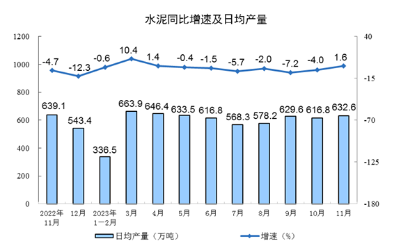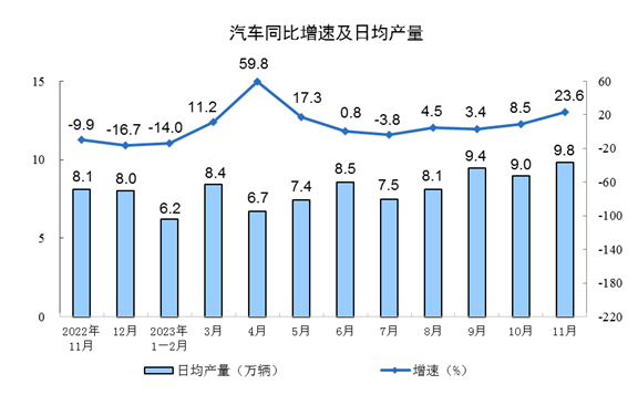 分產品看,11月份,620種產品中有367種產品產量同比增長。其中,鋼材11044萬噸,同比增長4.2%;水泥18979萬噸,增長1.6%;十種有色金屬650萬噸,增長7.1%;乙烯269萬噸,增長4.8%;汽車295.3萬輛,增長23.6%,其中新能源汽車100.6萬輛,增長35.6%;發電量7310億千瓦時,增長8.4%;原油加工量5953萬噸,增長0.2%。