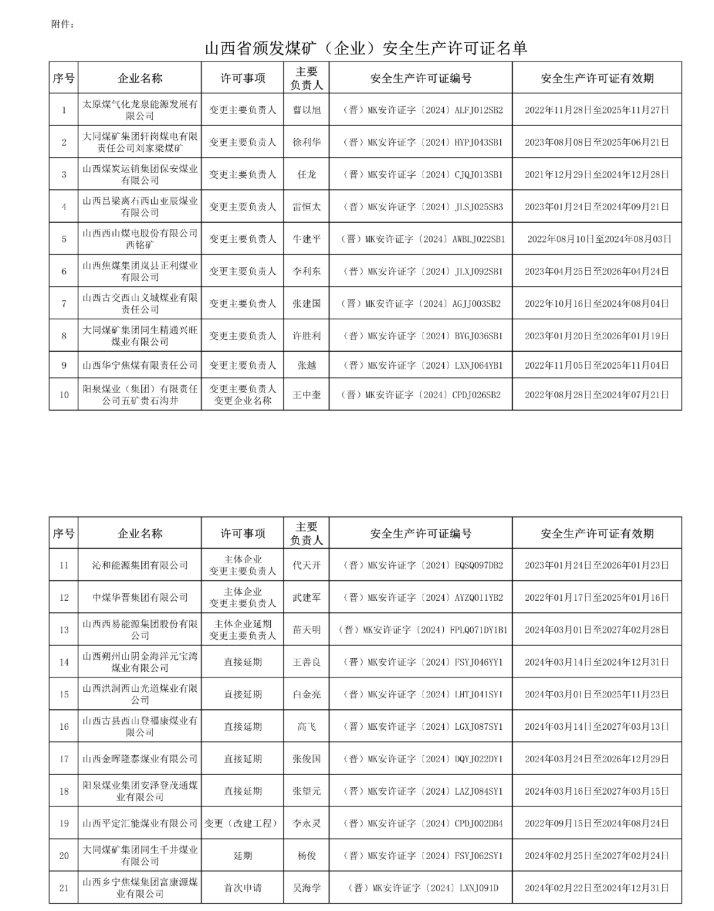 以及本次2月23日,為太原煤氣化龍泉能源發展有限公司等21座煤礦(企業)頒發安全生產許可證。