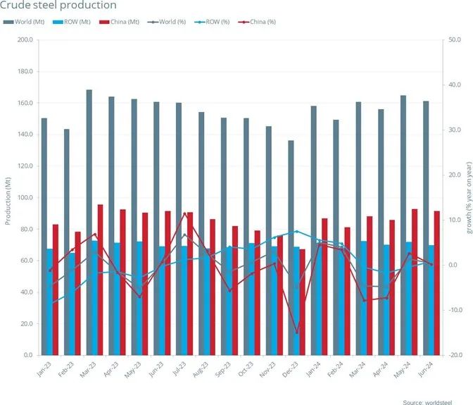 2024年6月全球71個納入國際鋼鐵協(xié)會計算國家的粗鋼產(chǎn)值為1.614億噸,同比進(jìn)步0.5%。