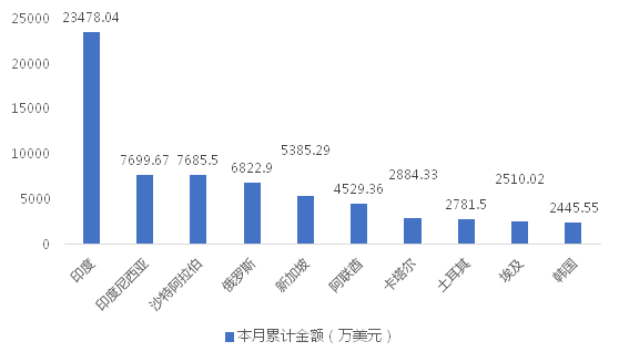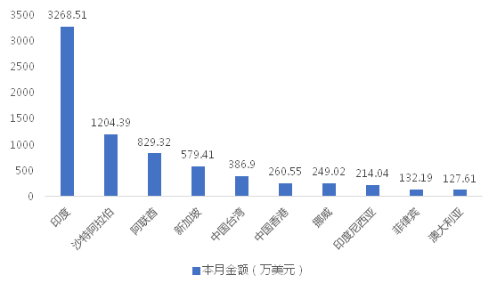 2024年12月,我國履帶式起重機(jī)出口金額排名前十位的國家/地區(qū)分別為印度、沙特阿拉伯、阿聯(lián)酋、新加坡、中國臺灣、中國香港、挪威、印度尼西亞、菲律賓、澳大利亞,合計占我國該產(chǎn)品出口總額的85.67%。其中,向印度出口最多,金額為3268.51萬美元,占出口總額的38.61%。