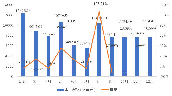 1-12月,我國履帶式起重機(jī)累計出口金額為94606.76萬美元,同比增長13.24%;累計出口數(shù)量為9294臺,同比增長248.61%;出口均價為10.18萬美元/臺,同比下降67.52%。