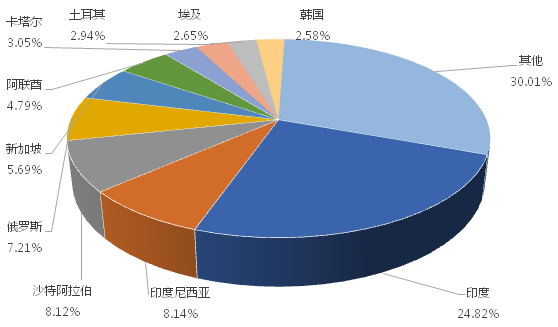 1-12月,我國履帶式起重機(jī)出口金額排名前十的國家/地區(qū)分別為印度、印度尼西亞、沙特阿拉伯、俄羅斯、新加坡、阿聯(lián)酋、卡塔爾、土耳其、埃及、韓國,合計占我國該產(chǎn)品出口總額的70.00%。其中,向印度出口最多,金額為23478.04萬美元,占出口總額的24.82%。