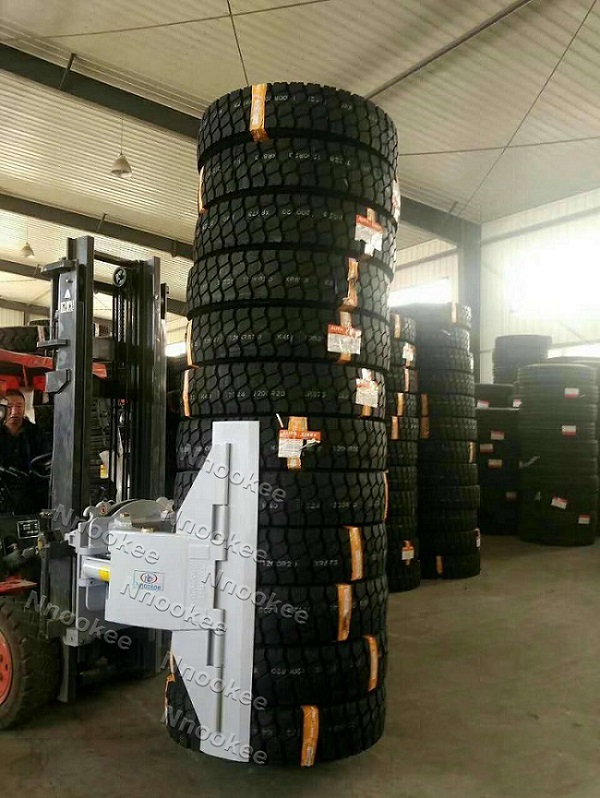 輪胎夾是諾克為輪胎制造企業所研發出來的高效叉車機械手,裝載了輪胎夾以后,叉車一次可以直接穩當地夾起五個以上的輪胎,既改善了人力運作的高成本,也能以更高的效率完成輪胎的倉儲工作。