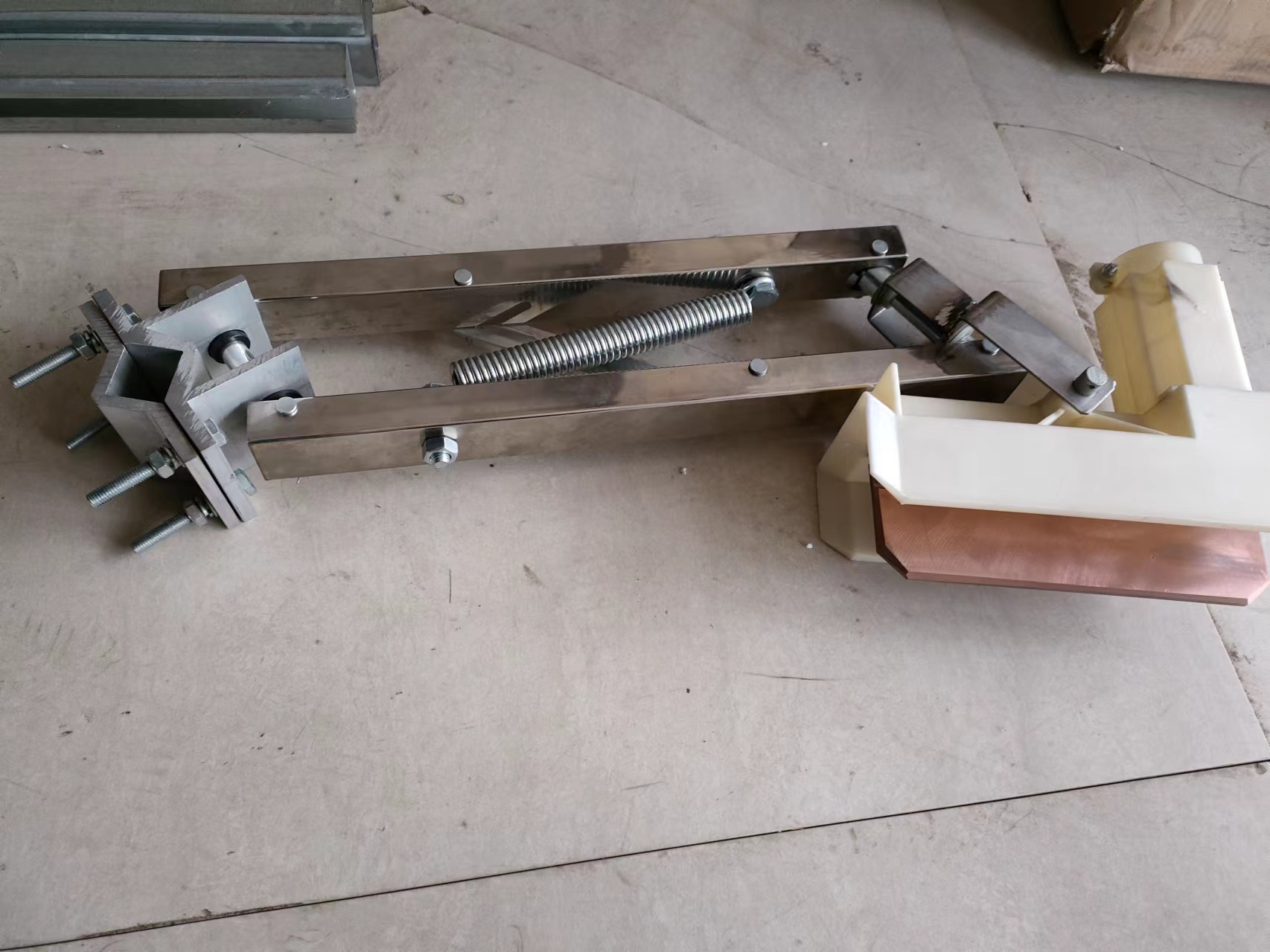 集電器滑觸線系統(tǒng)中集電側(cè)拾取電能的主要裝置,它通過(guò)集電刷與導(dǎo)軌的滑動(dòng)接觸,將電能直接傳導(dǎo)至用電器,從而實(shí)現(xiàn)系統(tǒng)的移動(dòng)供電。集電器由機(jī)械結(jié)構(gòu)的張力裝置和直接與導(dǎo)軌滑動(dòng)接觸的集電刷兩部分組成。