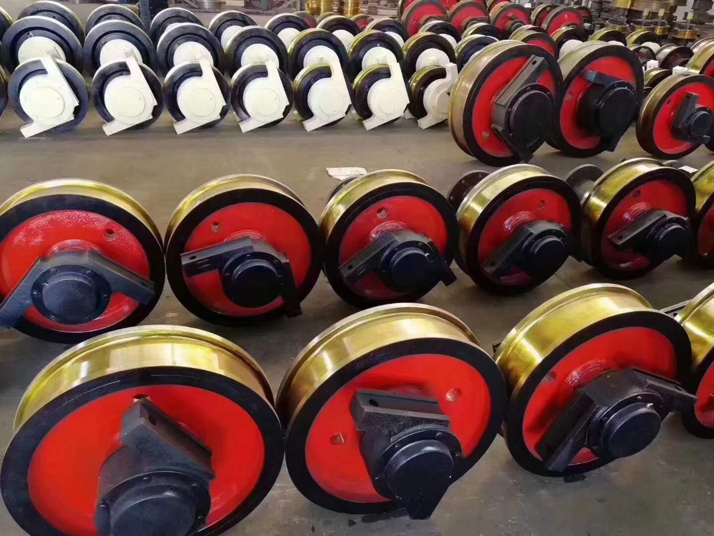 車輪組主要由車輪、軸、軸承箱組成。為便于安裝和維修,將車輪安裝在可整體拆卸接得角箱中,形成獨(dú)立部件。起重機(jī)運(yùn)行機(jī)構(gòu)車輪的水平偏斜值是起重機(jī)重要的技術(shù)參數(shù),偏斜值超差會(huì)造成啃軌,增大運(yùn)行阻力,產(chǎn)生振動(dòng)和噪音,加劇軌道和車輪磨損,大大降低起重機(jī)使用壽命,所以各類起重機(jī)制造技術(shù)條件都要對(duì)車輪水平偏斜規(guī)定允許的數(shù)值車輪組使用注意事項(xiàng):(1)車輪踏面磨損,車輪踏面磨損量超過(guò)原厚度的15%時(shí)應(yīng)更換新件,沒(méi)超過(guò)此值,可重新車制、熱處理修復(fù)。車輪直徑應(yīng)在公差范圍內(nèi),表面淬火硬度HB300~500,對(duì)車輪直徑大于Φ400mm的淬火層厚度應(yīng)大于20mm;小于Φ400mm時(shí),淬火層厚不應(yīng)小于15mm。 (2)踏面橢圓度:車輪踏面橢圓度達(dá)1mm應(yīng)報(bào)廢 (3)車輪組裝配:安裝好的車輪組件,應(yīng)能手轉(zhuǎn)動(dòng)靈活,安裝在同一平衡架上的幾個(gè)車輪**在同一垂直平面內(nèi),允許偏差為1mm